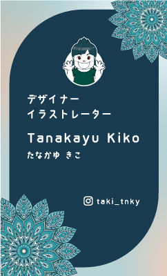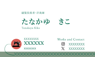 同じく洋裁師の方の名刺。名前がや連絡先などの情報が見えやすいよう視認性の高い色の組み合わせにしました。洋裁師のイメージしやすいミシンと縫い目を入れています。