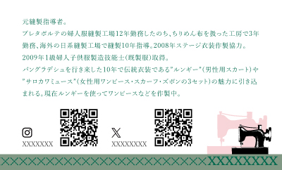 洋裁師のショップカードです。洋裁のイメージであるミシンのイラスト、バングラデシュの伝統衣装をリメイクして服を作る事から国旗の色相を使ったデザインにしています。